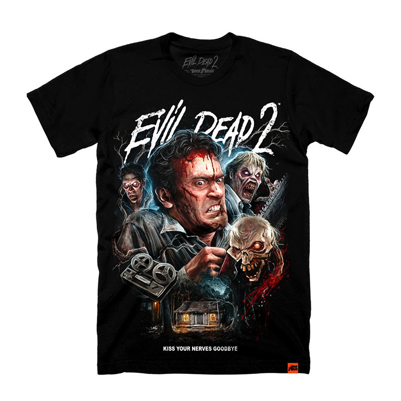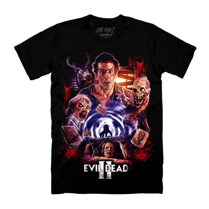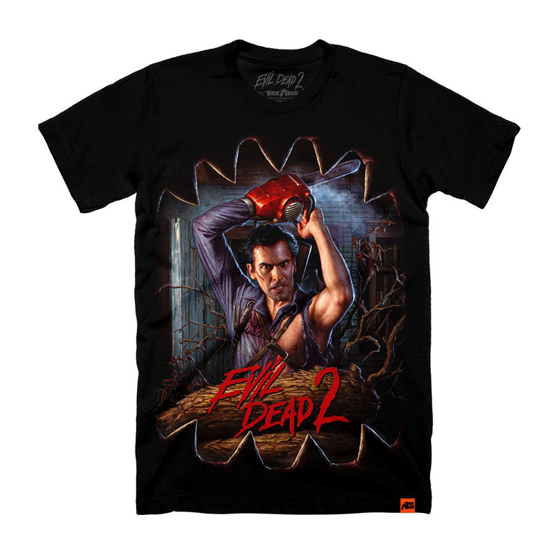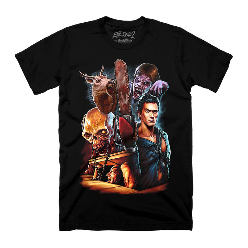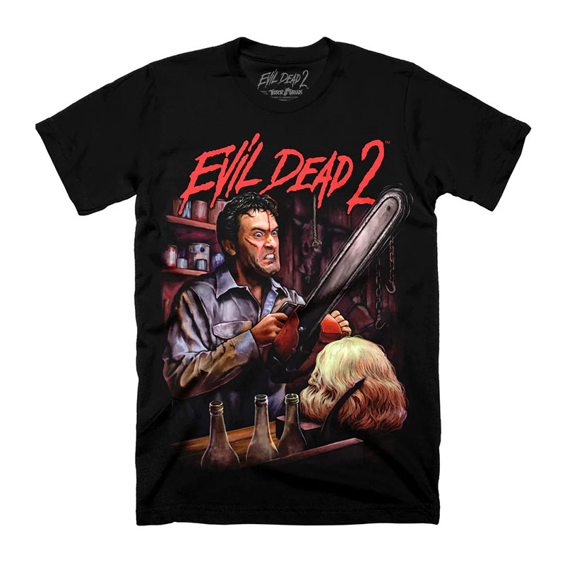 Collection of officially licensed Evil Dead 2 shirts designed and produced by various horror apparel brands. Please note: we do not sell or keep stock of any of these shirts on our site. This is page is strictly for archival purposes. Please visit the respective shops to buy their shirts.