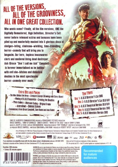 • NEW Medieval Times: The Making Of “Army Of Darkness” Featuring Interviews With Star & Co-Producer Bruce Campbell, Actors Marcus Gilbert, Ted Raimi, Timothy Quill, Richard Grove, Bill Moseley, Patricia Tallman And Angela • • Featherstone, Director Of Photography Bill Pope, Editor Bob Murawski, Production Designer Anthony Tremblay, Composer Joseph Lo Duca, Costume Designer Ida Gearon, Special Make-Up Effects Artists Howard Berger, Tony Gardner, Robert Kurtzman, And Greg Nicotero, “Pit Bitch” Performer And Effects Artist William Bryan, Mechanical Effects Artist Gary Jones, First Assistant Director John Cameron, Visual Effects Supervisor William Mesa And Stunt Coordinator Christopher Doyle (96 min.)