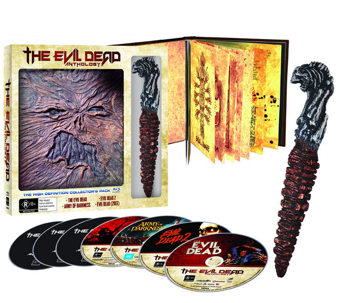 For the first time in the world, all 4 fantastic Evil Dead films. Included is the original 1981 Evil Dead, Evil Dead 2, Army of Darkness and Evil Dead (2013). This collectable pack also features collectible Necronomicon packaging, 16 pages of original drawings and a 23 cm replica prop of the dagger from Evil Dead 2. PLUS Heaps of bonus features and the premiere of the documentary ‘Invaluable’.